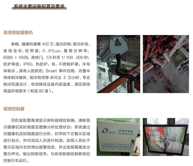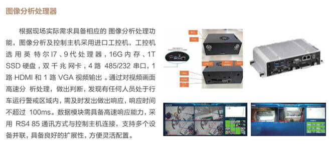 6、行車智控系統(tǒng):控制系統(tǒng)采用一體化模塊集成設(shè)計, 通過各子系統(tǒng)信號采集及圖像分析進(jìn) 行智能處理,快速準(zhǔn)確判斷各功能模 塊的異常現(xiàn)象,與主機PLC控制系統(tǒng) 通訊連接具備自動進(jìn)行報警、減速、斷電停車等功能,當(dāng)系統(tǒng)確認(rèn)發(fā)出信號指令后,控制系統(tǒng)和行車PLC連鎖進(jìn)行斷電處理,避免事故發(fā)生。