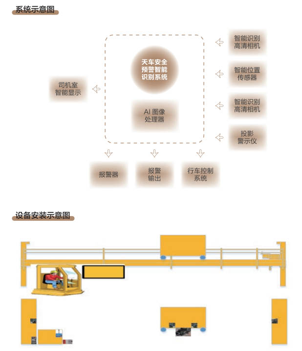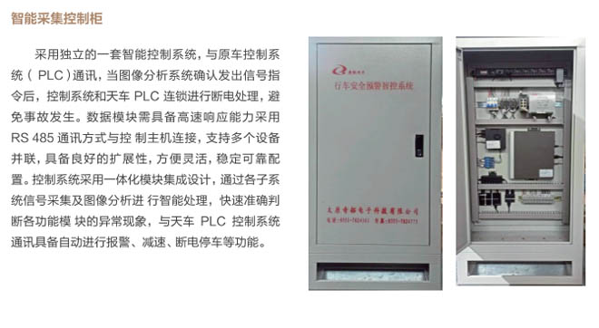 6、行車智控系統(tǒng):控制系統(tǒng)采用一體化模塊集成設(shè)計, 通過各子系統(tǒng)信號采集及圖像分析進(jìn) 行智能處理,快速準(zhǔn)確判斷各功能模 塊的異常現(xiàn)象,與主機PLC控制系統(tǒng) 通訊連接具備自動進(jìn)行報警、減速、斷電停車等功能,當(dāng)系統(tǒng)確認(rèn)發(fā)出信號指令后,控制系統(tǒng)和行車PLC連鎖進(jìn)行斷電處理,避免事故發(fā)生。